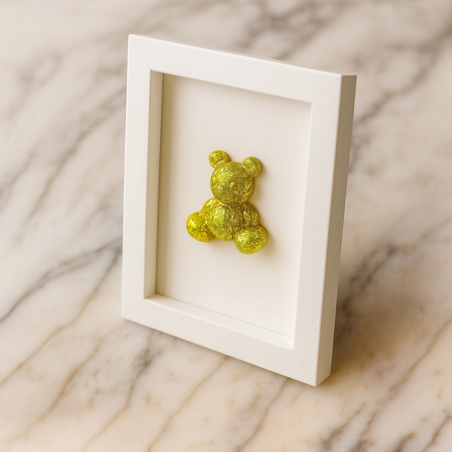 Bu el yapımı altın simli ayıcık figürlü çerçeve ile bebek veya çocuk odalarına ışıltılı ve sevimli bir dokunuş katın. 10 x 15 cm boyutlarındaki bu özel tasarım, parlak altın simlerle kaplanmış sevimli bir ayıcık figürünü beyaz bir çerçeve içinde sergiliyor. Reçine sanatı kullanılarak özenle hazırlanan bu dekoratif obje, bebek odası, kreş veya oyun alanları için mükemmel bir atmosfer yaratır.