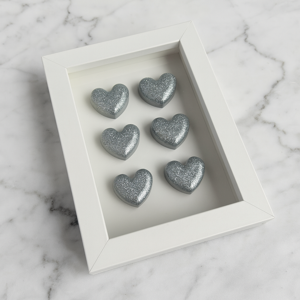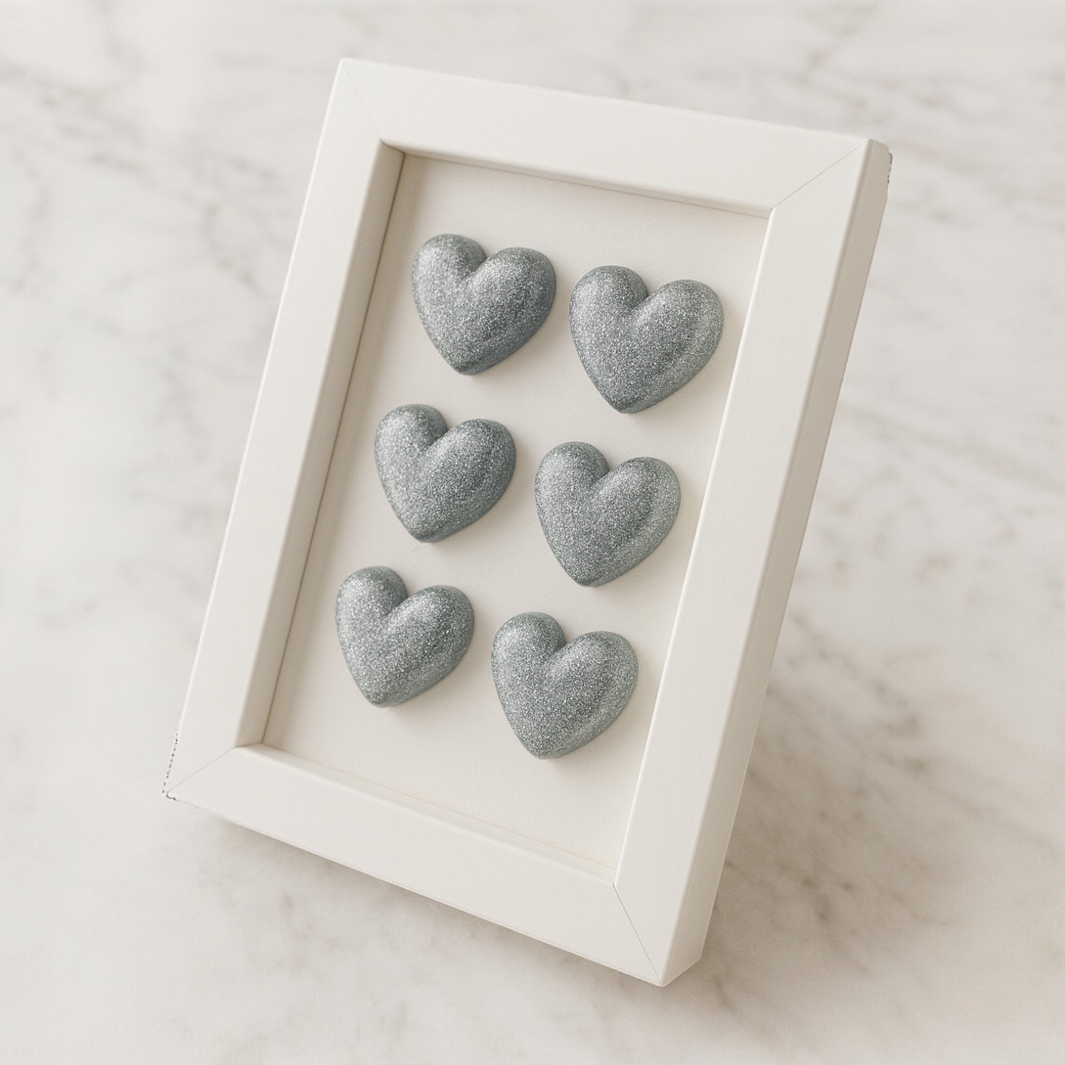 Bu el yapımı gümüş simli kalp dekoratif tablo ile evinize modern ve ışıltılı bir dokunuş katın. 10 x 15 cmboyutlarındaki bu özel tasarım, parlak gümüş simlerle bezeli altı kalbi beyaz çerçeve içinde sergiliyor. Reçine sanatı kullanılarak özenle hazırlanan bu minimalist duvar dekoru, yaşam alanınıza sofistike bir zarafet ve parlaklık getirecek.