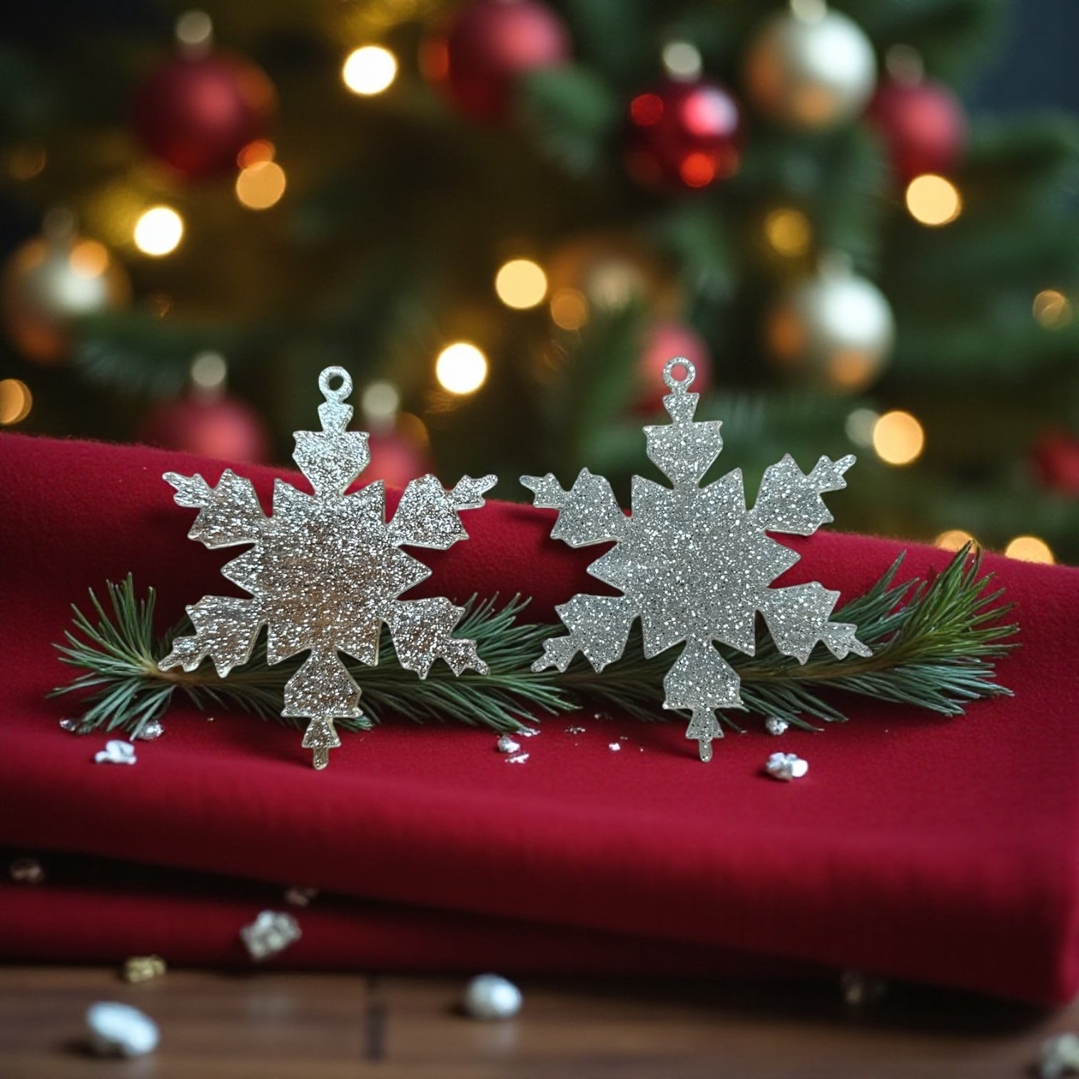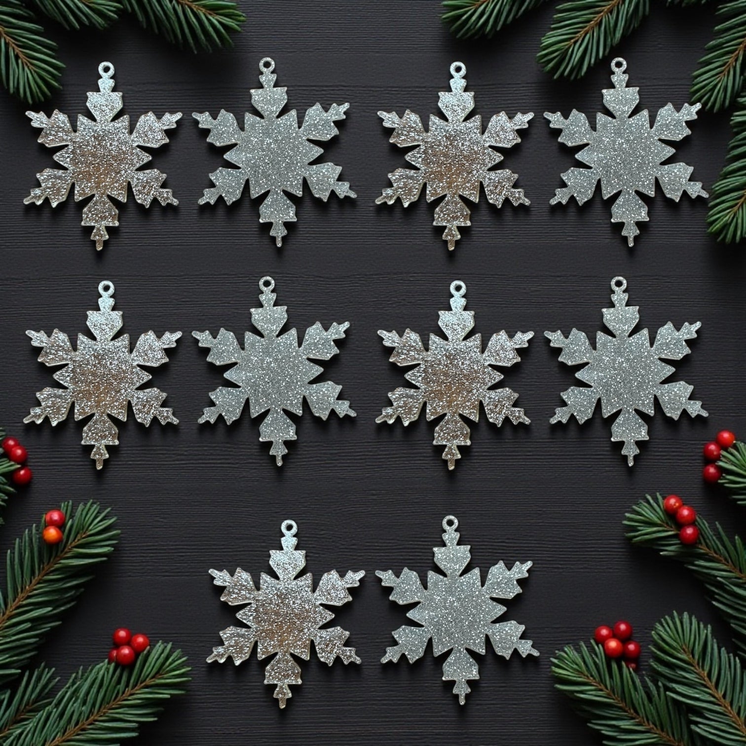 Harika bir ürün daha! Bu seferki ürün, kar tanesi motifli, gümüş simli reçine yılbaşı süsleri. Görselde toplam 10 adet süs bulunmaktadır.
