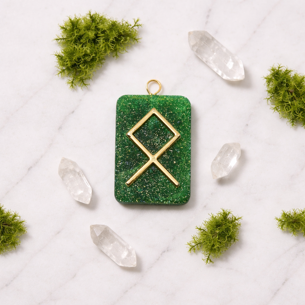 Othala Rune Reçine Kolye Ucu - Miras ve Aidiyet Sembolü - Yeşil Işıltılı El Yapımı Mitolojik Takı - Kadim Koruyucu Tılsım